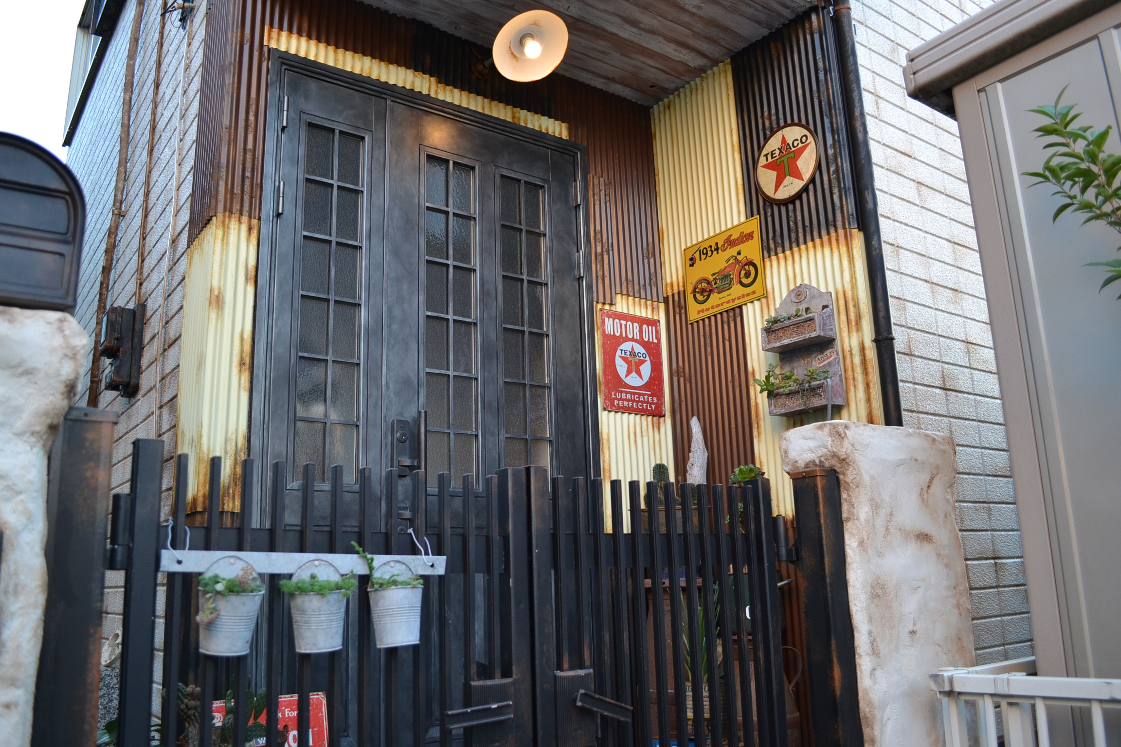 デザインリフォーム&エイジングペイント施工 さいたま市 住宅外壁 デザインリフォーム&エイジングペイント施工 さいたま市 外壁デザインリフォーム・Before さいたま市 外壁デザインリフォーム・After さいたま市 外壁デザインリフォーム・After さいたま市 住宅外壁デザインリフォーム&エイジングペイント施工 【施工内容】 住宅の外壁をエイジング施工しました。玄関前を波板トタンを壁に貼りエイジングを掛けました。 はり合わせ部分を少しずつ変えてレトロなイメージを出すようにしてます。 天井は元々は軽量ボードでしたが、エイジングした杉板をはり付け アメリカンな雰囲気を天井にも出しました。 照明の位置も天井を作業する時に玄関扉の上に変えて アンティーク感のある皿型の照明をエイジングして取り付けました。 玄関ドアもクロムメッキのようにエイジングして重厚感を出しました。 施工期間 4日間